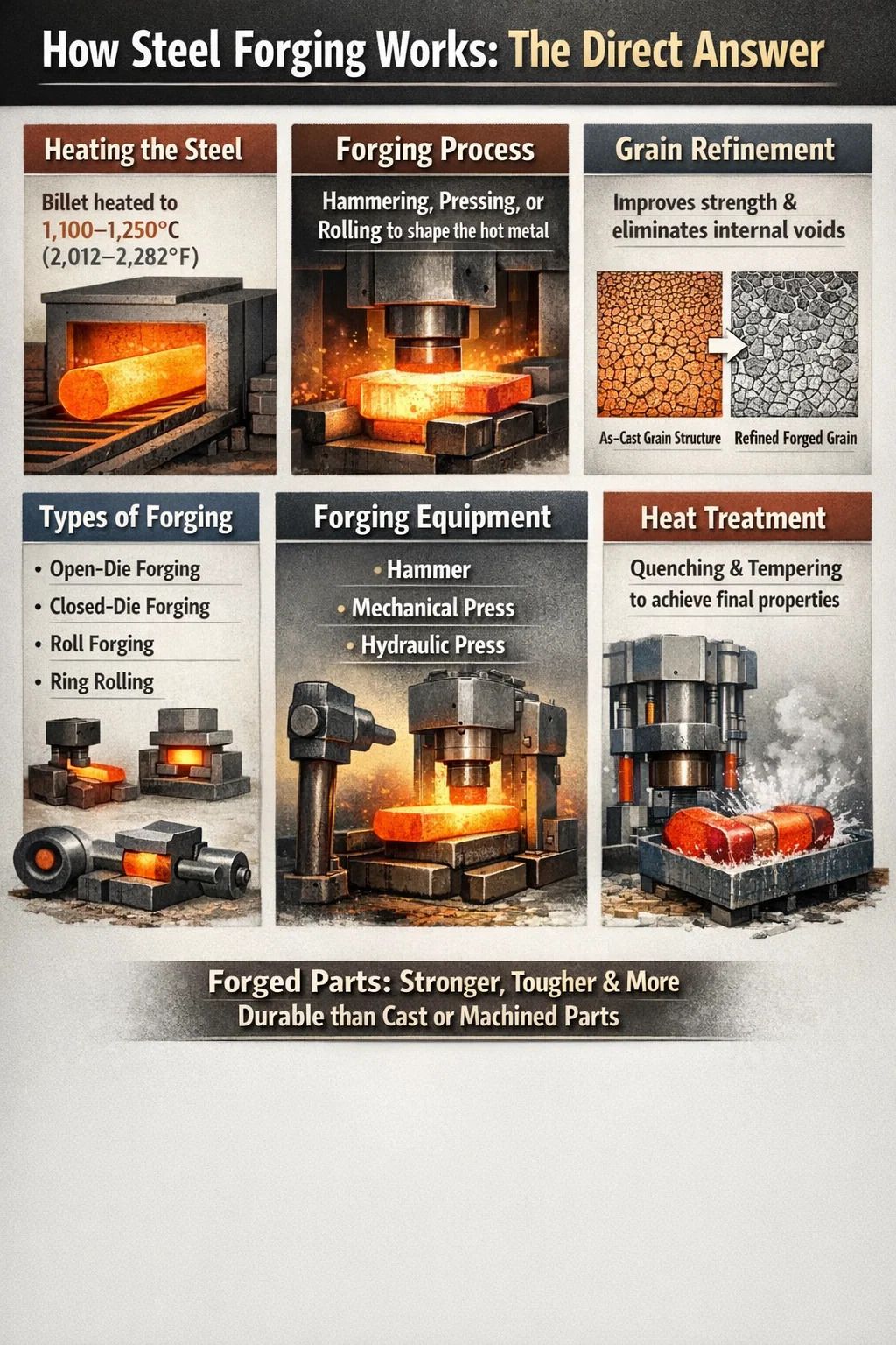 ইস্পাত forging কম্প্রেসিভ বল প্রয়োগ করে ইস্পাতকে আকার দেওয়ার প্রক্রিয়া - হয় হাতুড়ি, চাপ বা ঘূর্ণায়মান - যখন ধাতুকে এমন তাপমাত্রায় উত্তপ্ত করা হয় যা এটিকে প্লাস্টিক এবং কার্যকর করে তোলে তবে গলিত হয় না। ফলাফল সঙ্গে একটি অংশ উচ্চতর যান্ত্রিক বৈশিষ্ট্য ঢালাই বা মেশিনযুক্ত উপাদানগুলির তুলনায়, কারণ ফোরজিং প্রক্রিয়া অভ্যন্তরীণ শস্য কাঠামোকে পরিমার্জিত করে এবং অভ্যন্তরীণ শূন্যতা দূর করে।